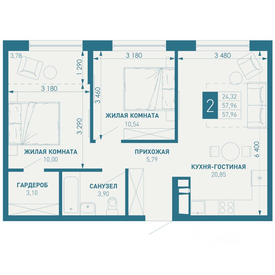 Общая площадь57,96 м2