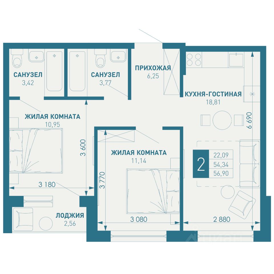 Общая площадь56,9 м2