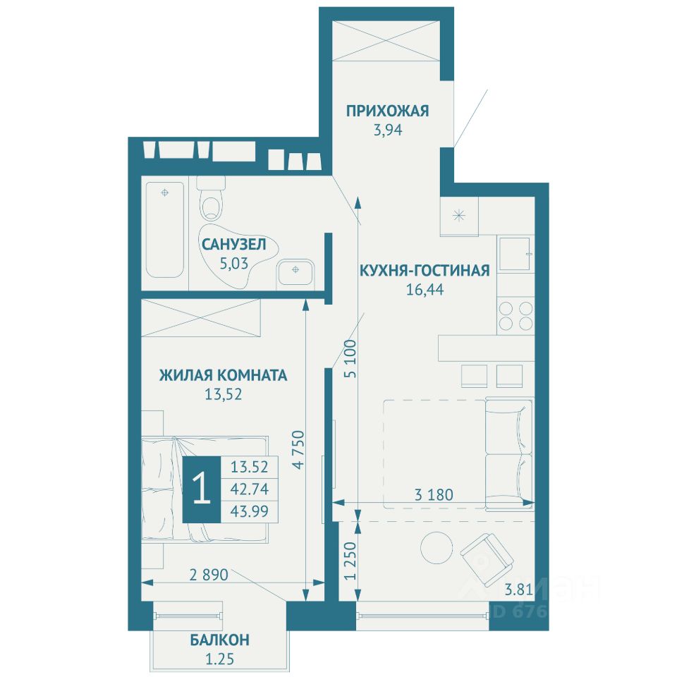Общая площадь43,99 м2