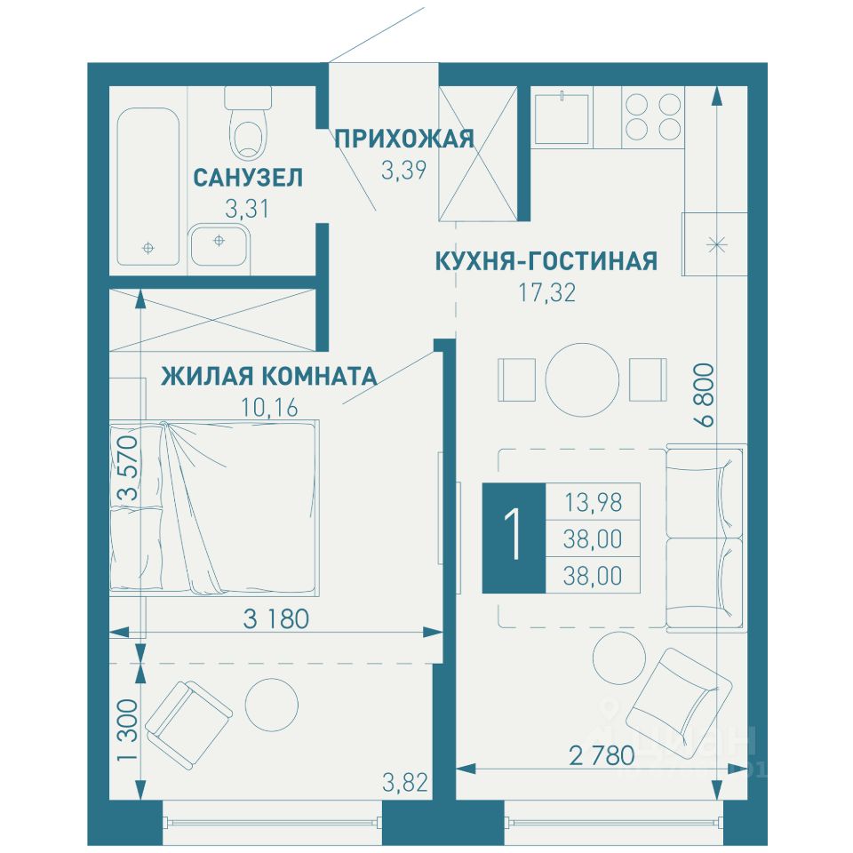 Общая площадь38 м2