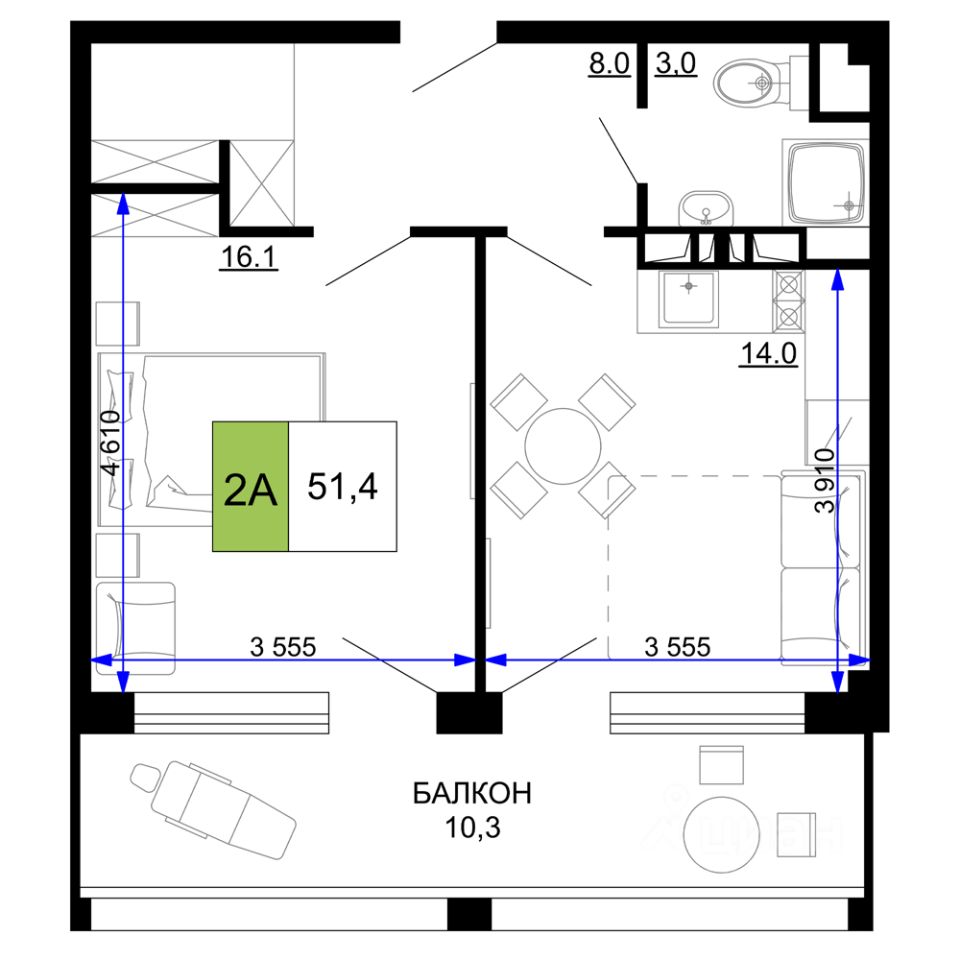 Общая площадь51,4 м2