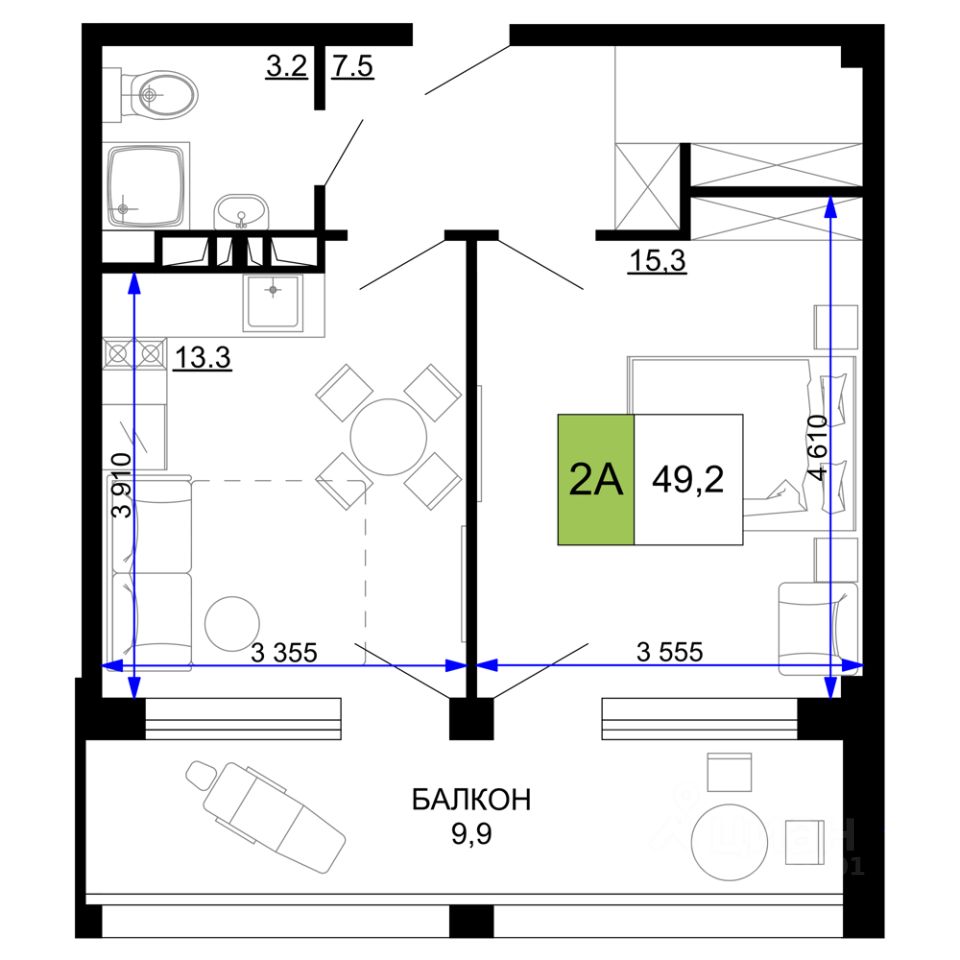Общая площадь49,2 м2