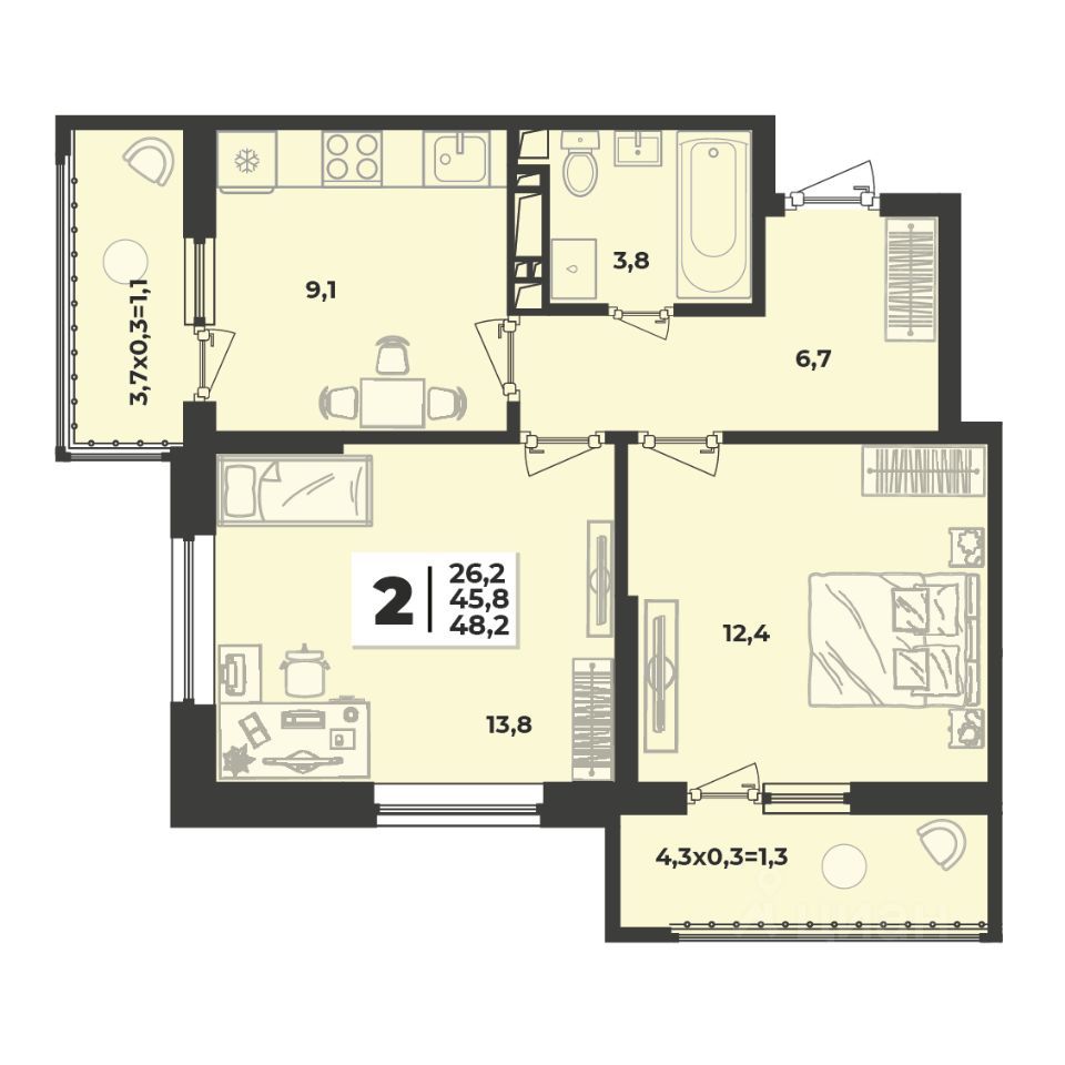 Продаётся 2-комнатная квартира в сданном доме (Литер 1.6), срок сдачи: III-кв. 2025, общей площадью 48.2 кв.м., на 2 этаже. Новый жилой комплекс ''Лето'' от застройщика ''ГК Дарстрой'' расположен по адресу город Краснодар, улица Западный Обход.
