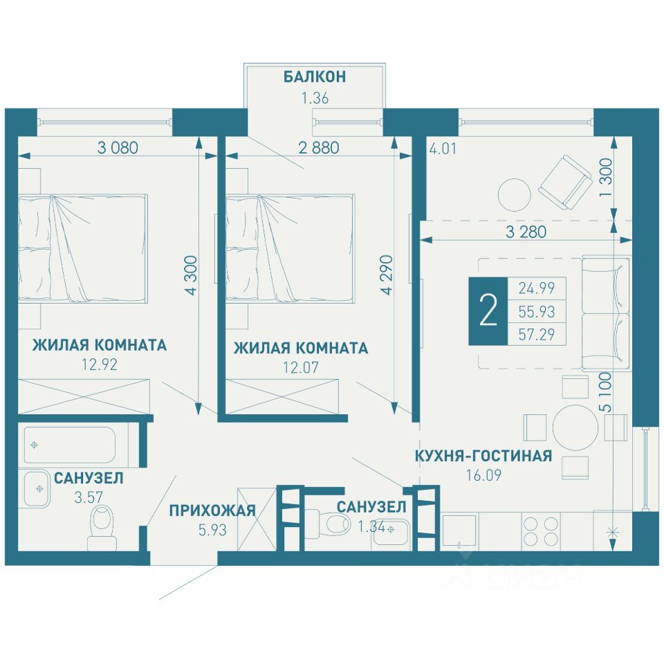 Общая площадь57,29 м2