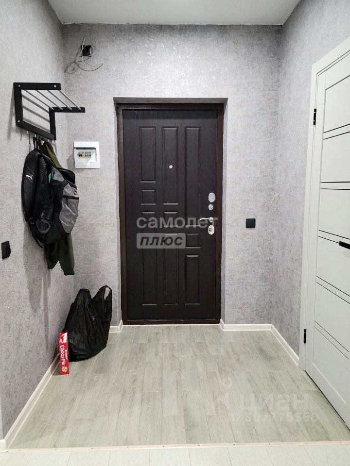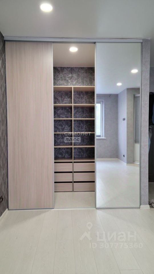 В квартире выделена гардеробная зона, оборудованная вместительным шкафом и боковыми полками.