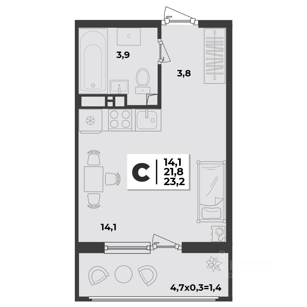 Общая площадь23,2 м2