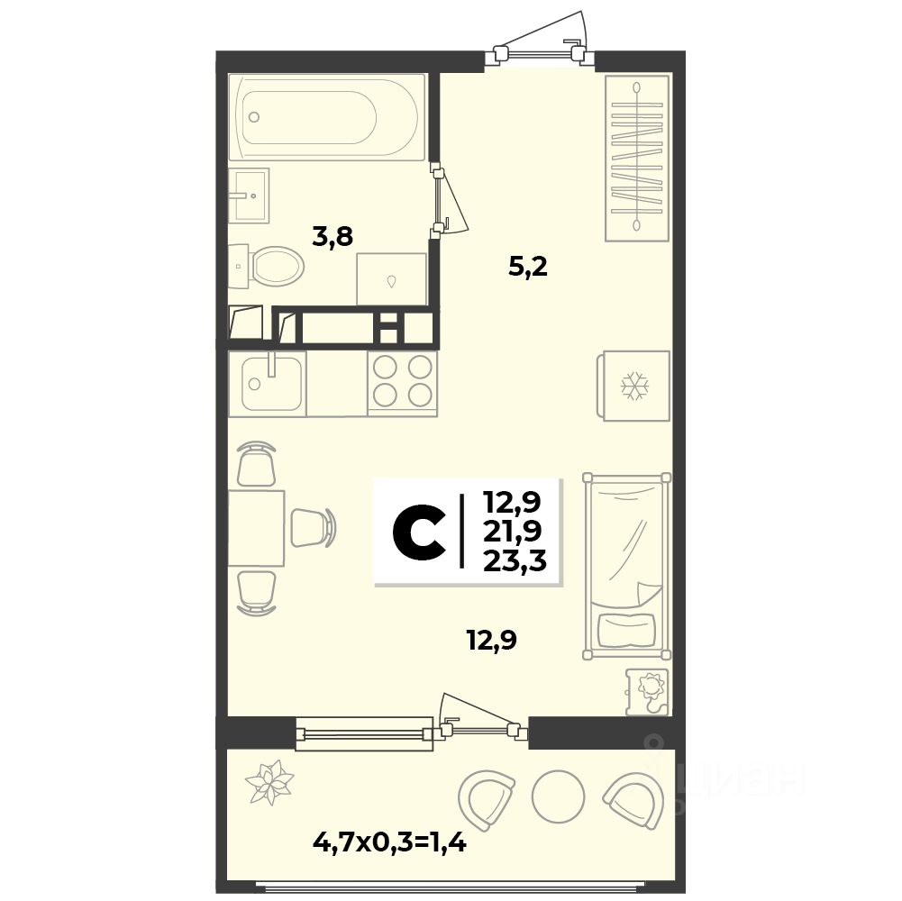 Общая площадь23,3 м2