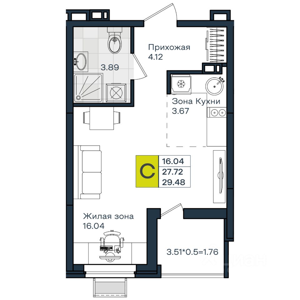 Общая площадь29,48 м2