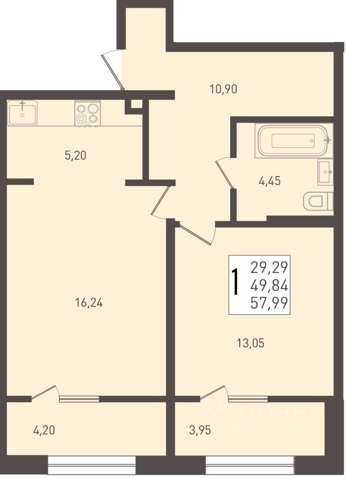 Общая площадь57,99 м2