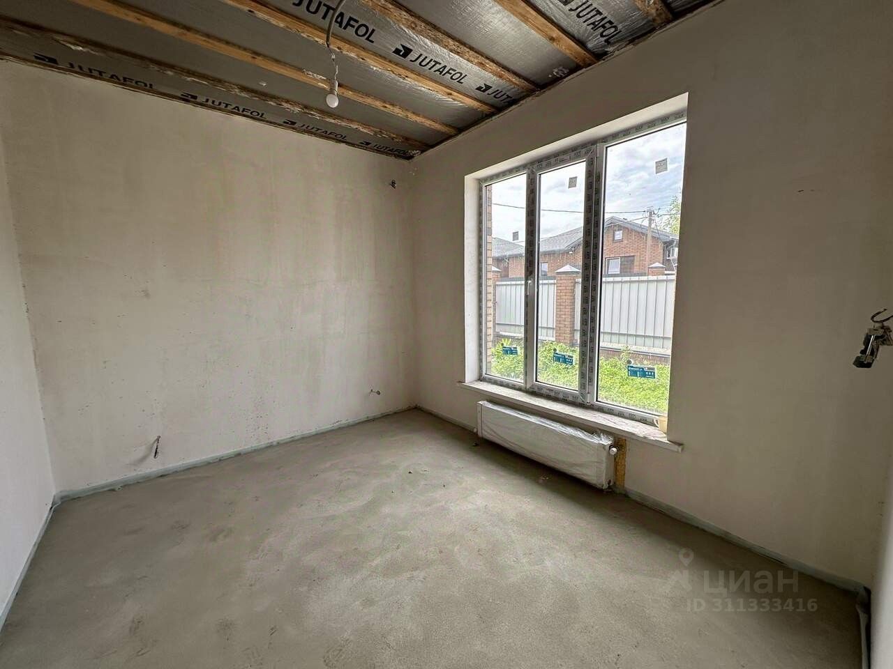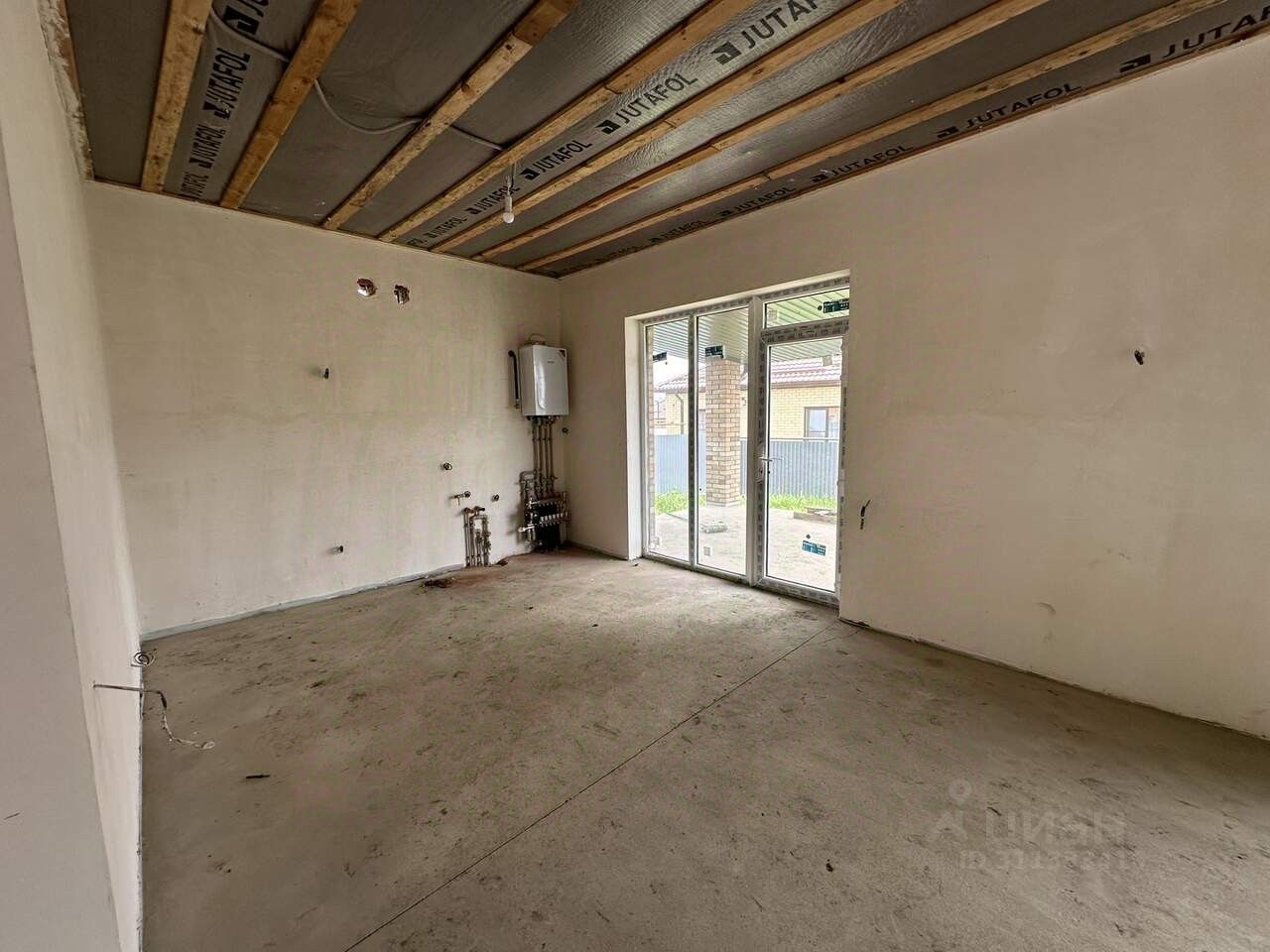 Планировка: Кухня-гостиная, с выходом на просторную террасу, 3 спальни, санузел, прихожая. Выполнена предчистовая отделка, газовый котел, система ''теплый пол'', радиаторы отопления.