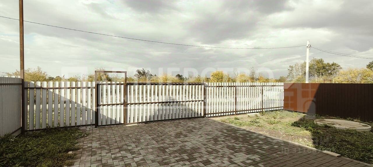 Двор выложен плиткой, стоит забор, откатные ворота.