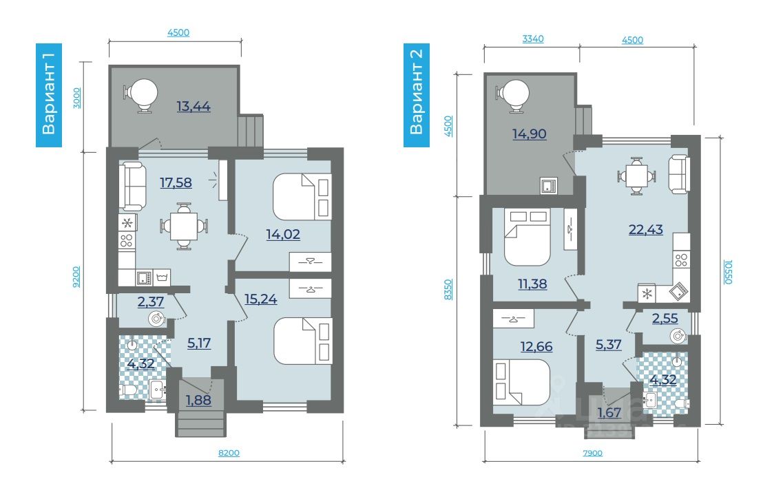 В доме две спальни (14 и 15 кв. м.) и кухня-гостиная 18 кв. м. с выходом на террасу 13 кв. м.