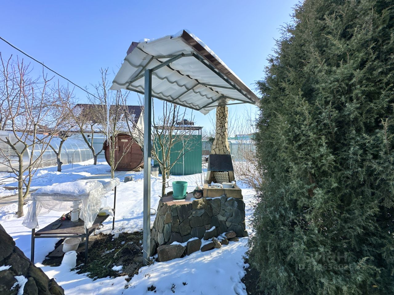 Участок окружён множеством цветущих растений и деревьев, что создаёт прекрасную атмосферу для жизни и досуга.