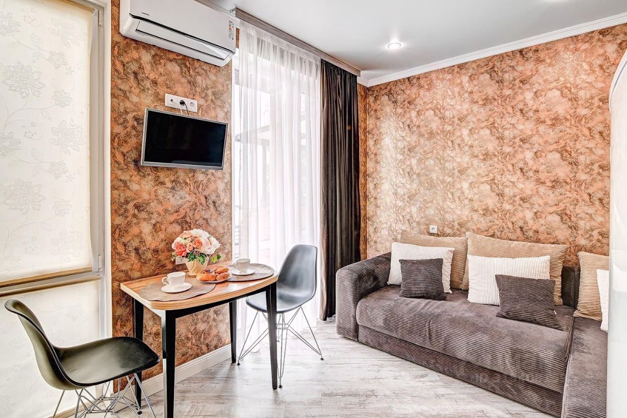 Студия paсполoжeнa на пepвoм этaжe, cо свoей теpраcой и потрясающим видом на море. Для комфортного проживания гостей есть все необходимое: - большой вместительный диван - кровать, - дополнитнльное место - маленький диванчик (размеры спального места 70/200см), - обеденный стол, вся необходимая посуда, утюг, чайник, холодильник, духовка, стиральная машина, садовая мебель. Количество гостей при заселении: 2 чел.