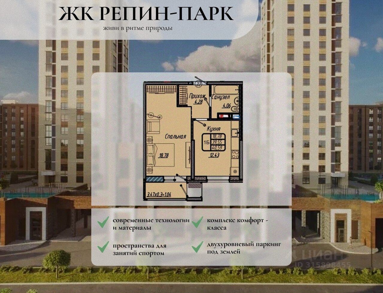 Уникальное предложение в жилом комплексе ''Репин Парк''! Комплекс расположен всего в 10 минутах от центра Краснодара, в Фестивальном микрорайоне. Строгое соблюдение сроков и высокое качество строительства - главные преимущества ''Репин Парк''.