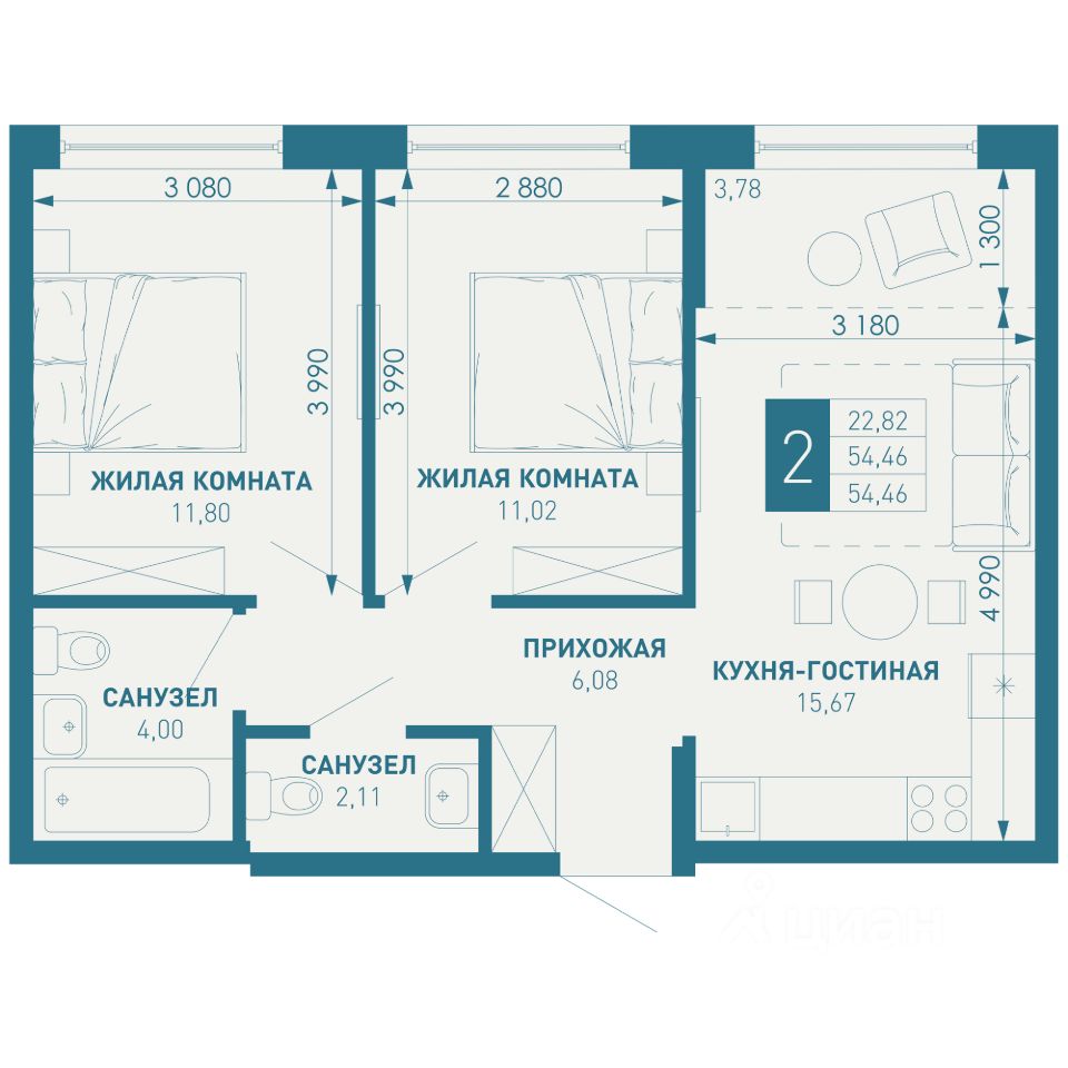 Общая площадь54,46 м2