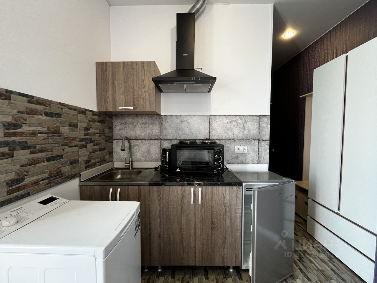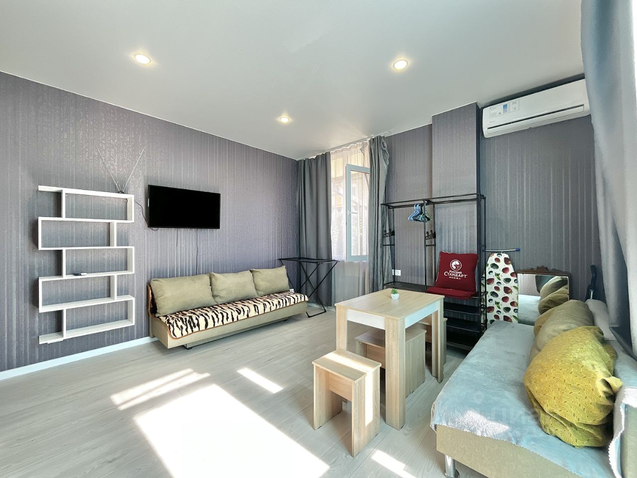 Квартира оборудована: два дивана-кровати, холодильник, кондиционер, духовой шкаф, санузел, телевизор, шкаф для хранения вещей .