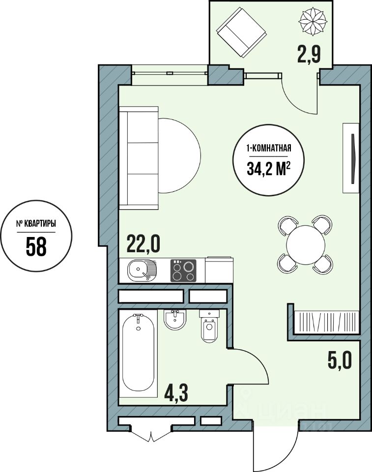Общая площадь34,2 м2