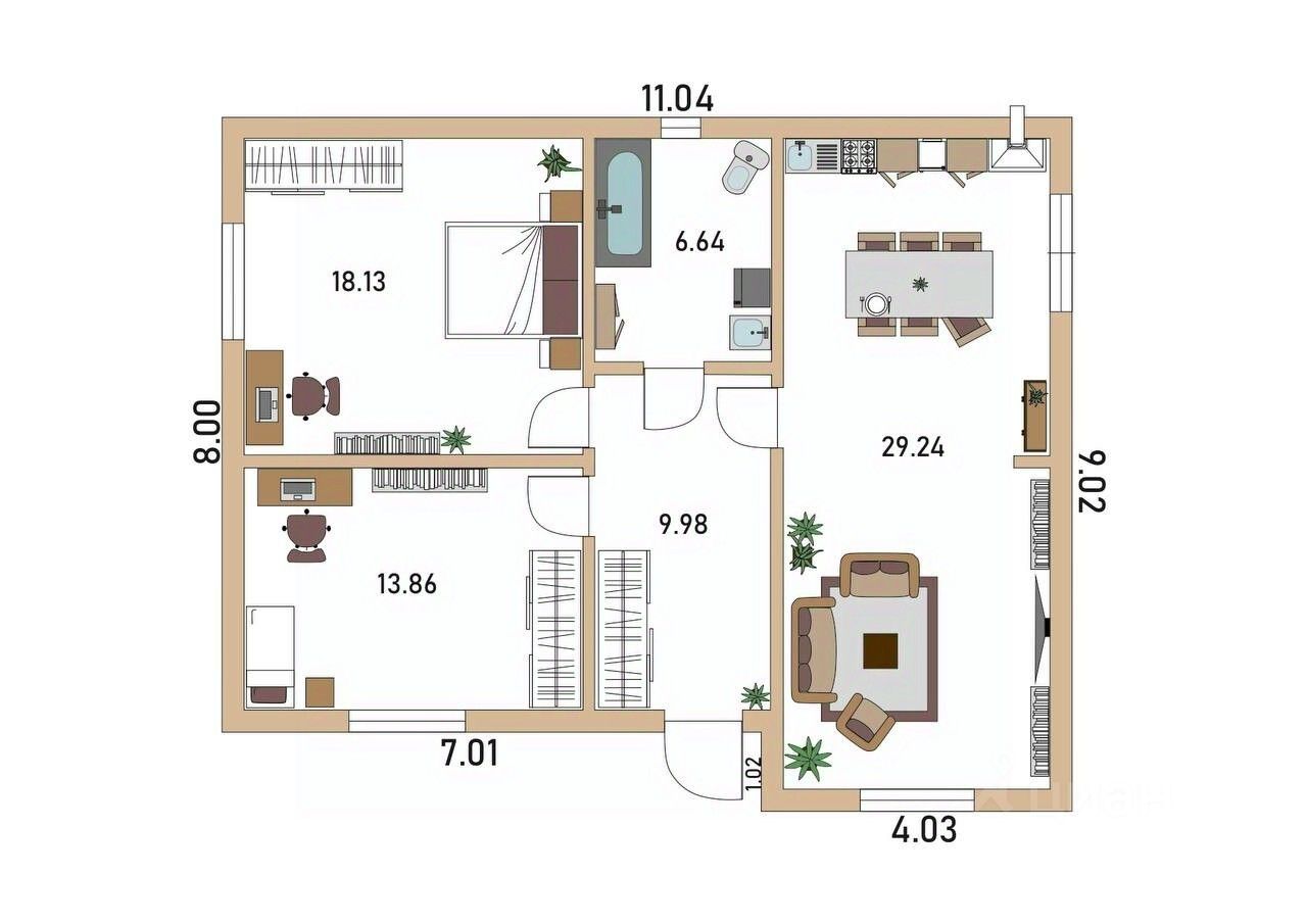 В доме на первом этаже 81.3 м2: 2 изолированные спальные комнаты 18.13 м2 и 13.86 м2, просторная светлая кухня-гостиная 29.24 м2 с выходом во двор.Сан узел совместный 6.64 м2, компактный коридор 9.98м2.