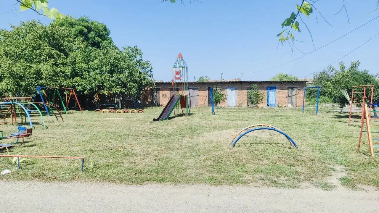 Зеленый двор с детской площадкой. Есть сарай.