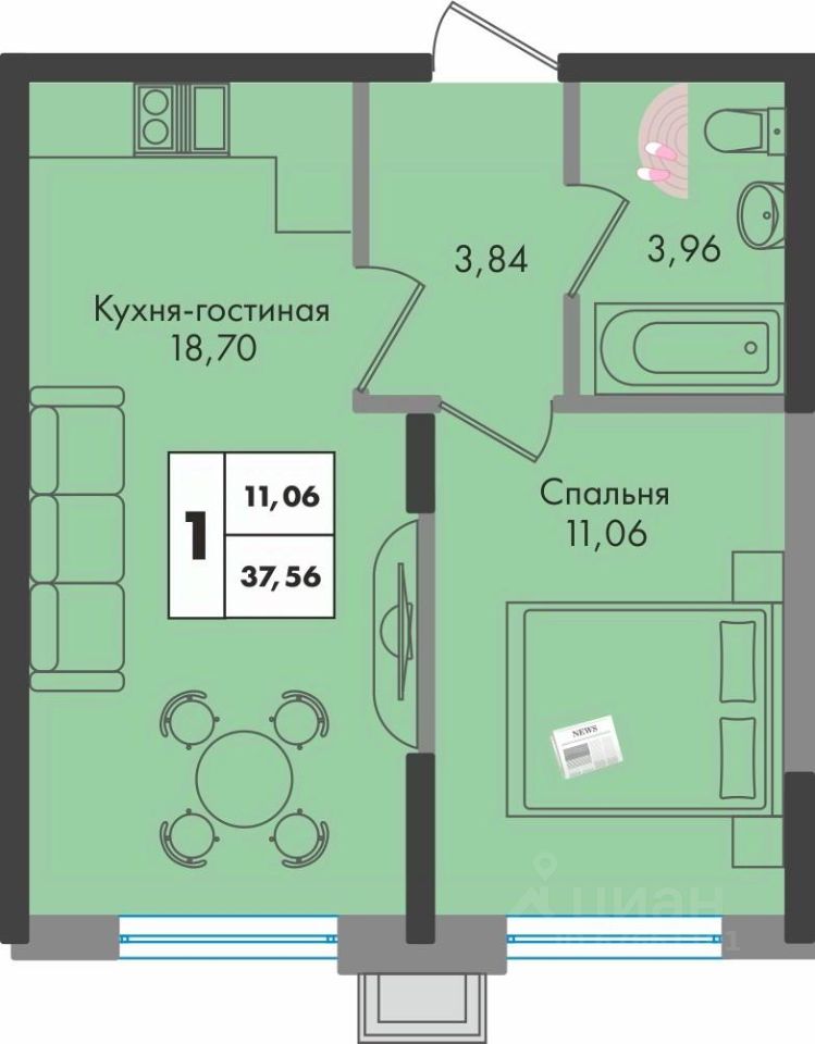 1-комнатная квартира с большой кухней-гостиной в жилом комплексе Зеленая территория от надежного застройщика СЗ Флагман в Краснодаре.