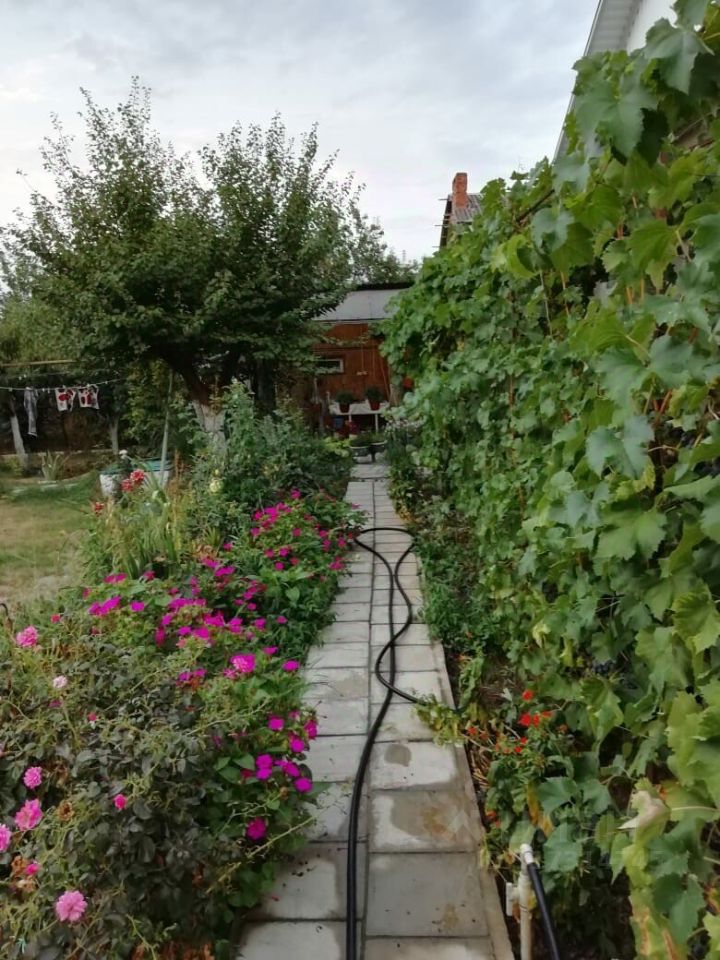 На ухоженном угловом земельном учaстке 10 сотoк, растут и плодоносят множество плодово-ягодных культур (яблони, груши, гранат, черешня, вишня, хурма, персик, абрикос, миндаль, калина, слива), ягодные кустарники, несколько видов клубники и винограда. Все дорожки забетонированы и выложены плиткой.