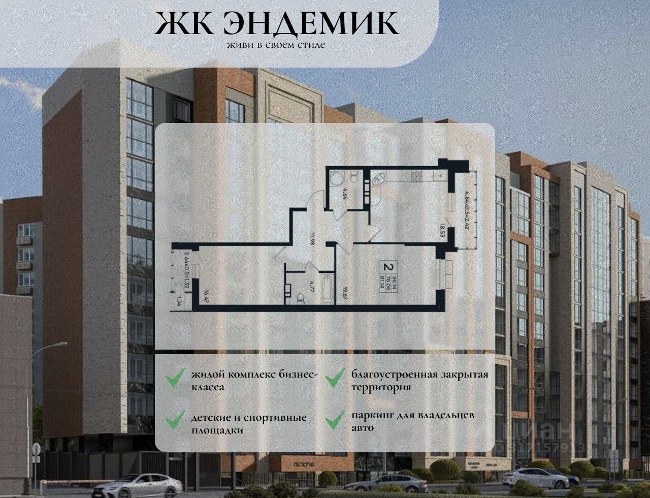 Эндемик представляет собой дом бизнес-класса переменной этажности 10-12 этажей из 4-х подъездов и примыкающего многофункционального коммерческого здания. В основе проектирования жилых пространств вдохновляющий простор. В доме Эндемик представлены различные варианты квартир от студий площадью 49 кв. м. до трехкомнатных площадью 106 кв. м. Отделка предчистовая с улучшенной штукатуркой стен. Благоустройство закрытой территории включает в себя детскую площадку из эко материалов, площадки для футбола, баскетбола и воркаута, места для спокойного отдыха, редкие виды растений и деревьев, ландшафтное озеленение ''4 сезона''. Круглосуточное видеонаблюдение ведется на паркинге, внешней и внутренней территории дома.