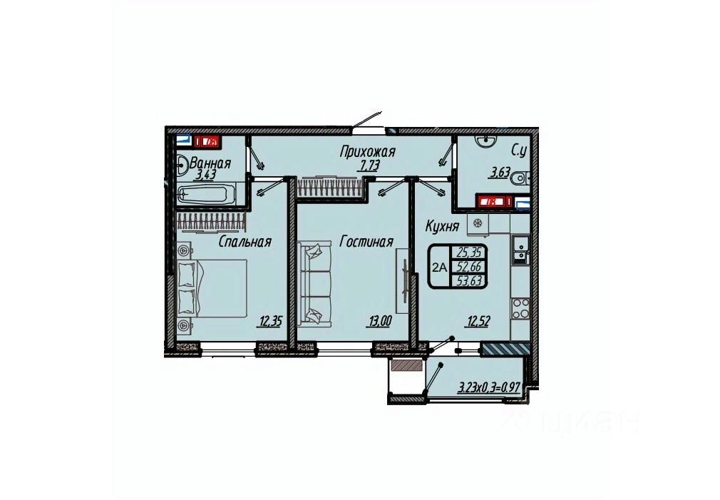 Общая площадь53,63 м2