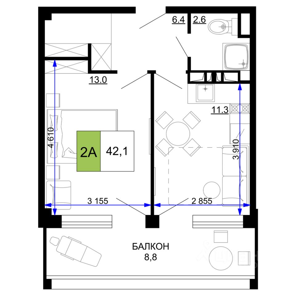 Общая площадь42,1 м2