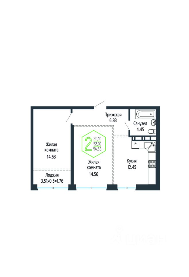 Общая площадь54,97 м2