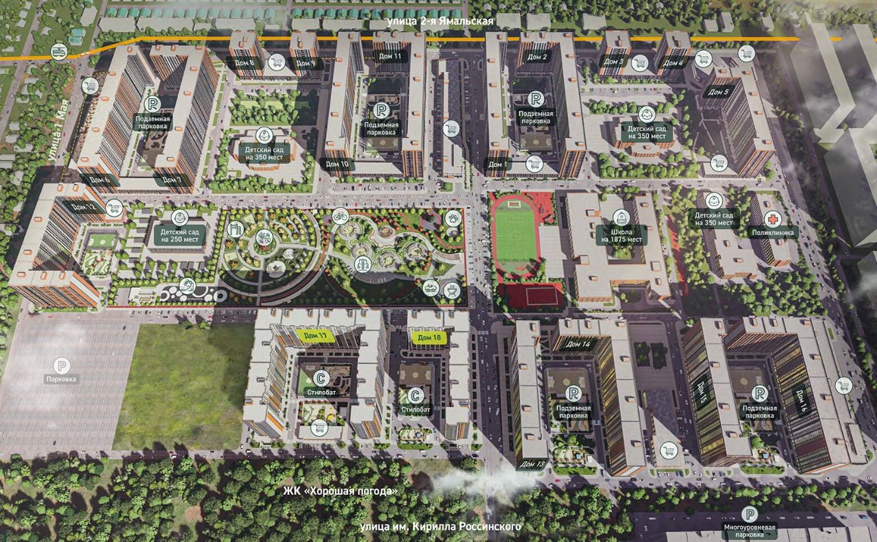 Жилой комплекс включает в себя 18 корпусов переменной этажности: от 18 до 21 этажей. Дом возводится по долговечной монолитной технологии с фасадами из керамического кирпича, с вставками декоративных элементов. В проекте выполнена дизайнерская отделка входных групп, установлены современные скоростные лифты. На первых этажах расположены закрытые боксы для хранения колясок и велосипедов.