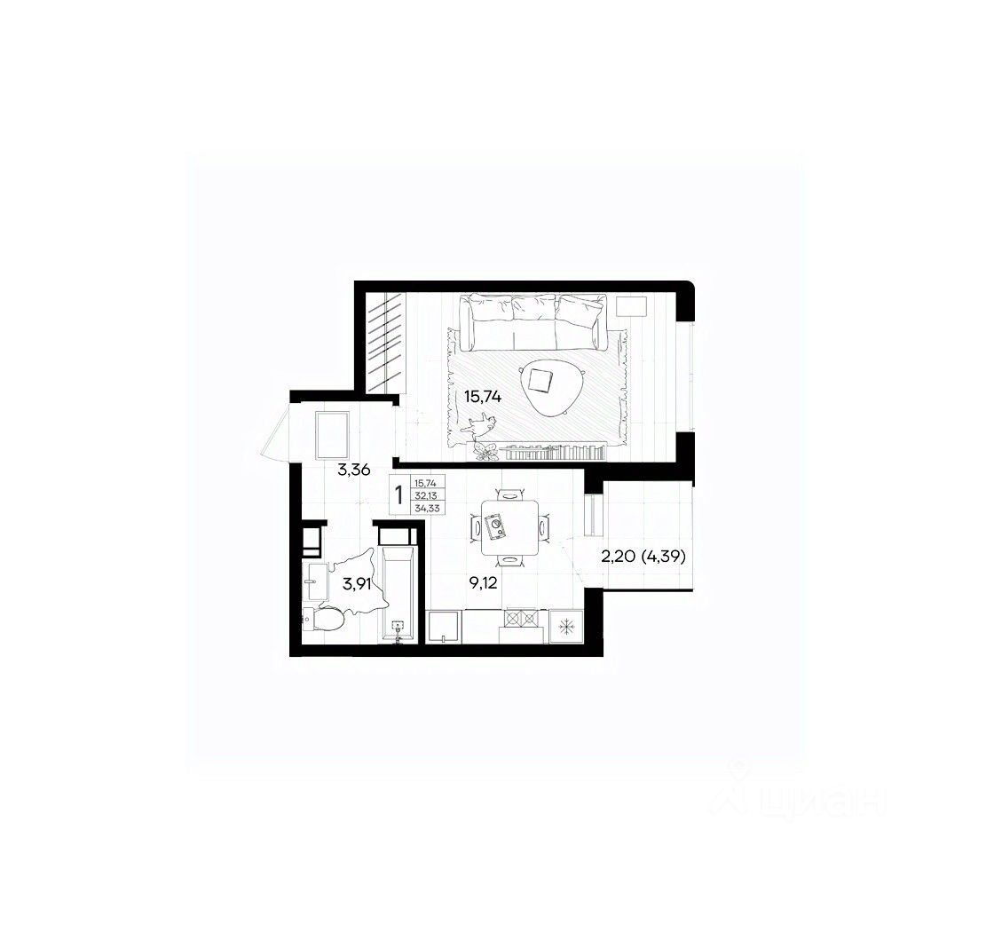 Общая площадь34,33 м2