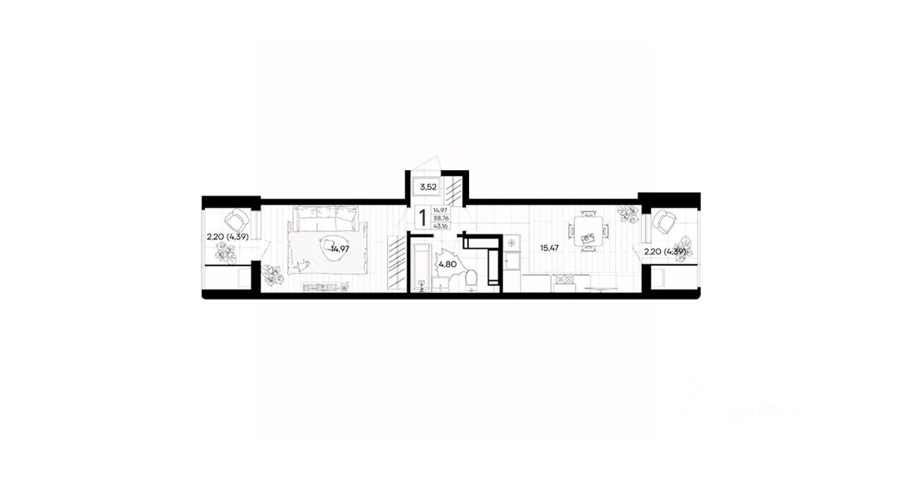 Общая площадь43,16 м2