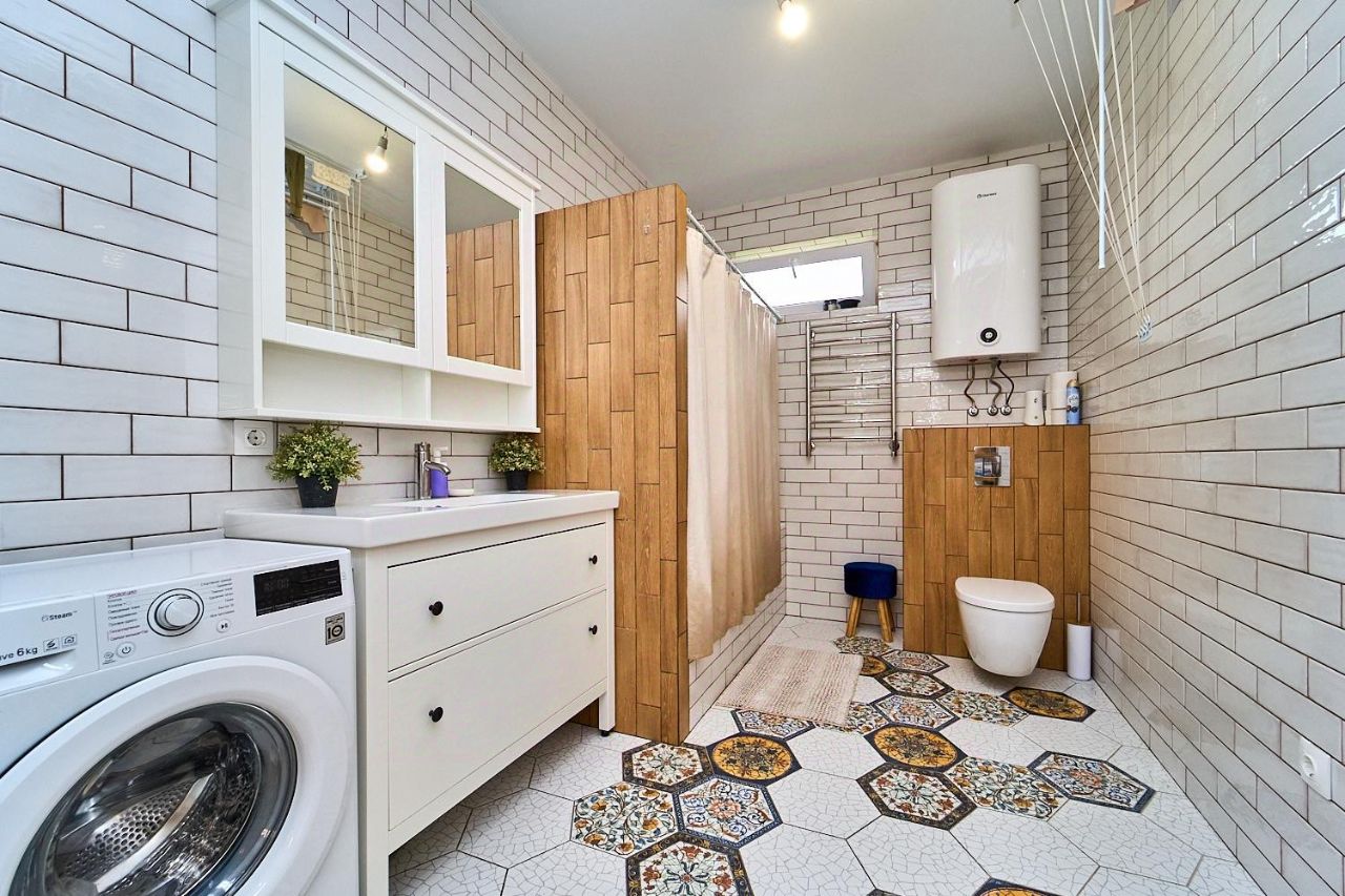 Современный и качественный ремонт, две спальни и большая кухня-гостиная. Установлен бойлер Аристон на 80л, Газовая плита (с отдельным подключением, через улицу). Газ по меже, соседи подключены. Отдельно выведен котел отопления, работающий на дизельном топливе Navian 17кВт. Септик на 12куб. Свет 5кВт. Теплый пол везде кроме спален. 2 сплинта,