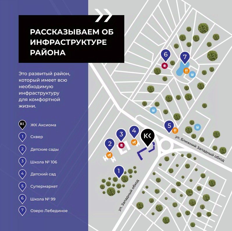 Жилой комплекс ''Аксиома'' расположен в районе с хорошо развитой инфраструктурой — в пешей доступности имеется все необходимое: продовольственные магазины, 2 детских сада, школа в 2 минутах ходьбы, аптеки, кафе и рестораны, салоны красоты, супермаркеты и рынок. Остановки общественного транспорта также расположены в 3 минутах ходьбы от жилого комплекса. В ближайшем будущем здесь будет проходить и трамвайная линия.