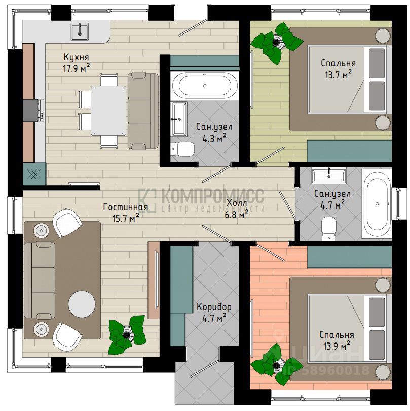 В доме: 2 спальни, кухня-гостиная, 2 сан.узла, коридор и прихожая. Отдельный выход на участок с тыльной части дома.