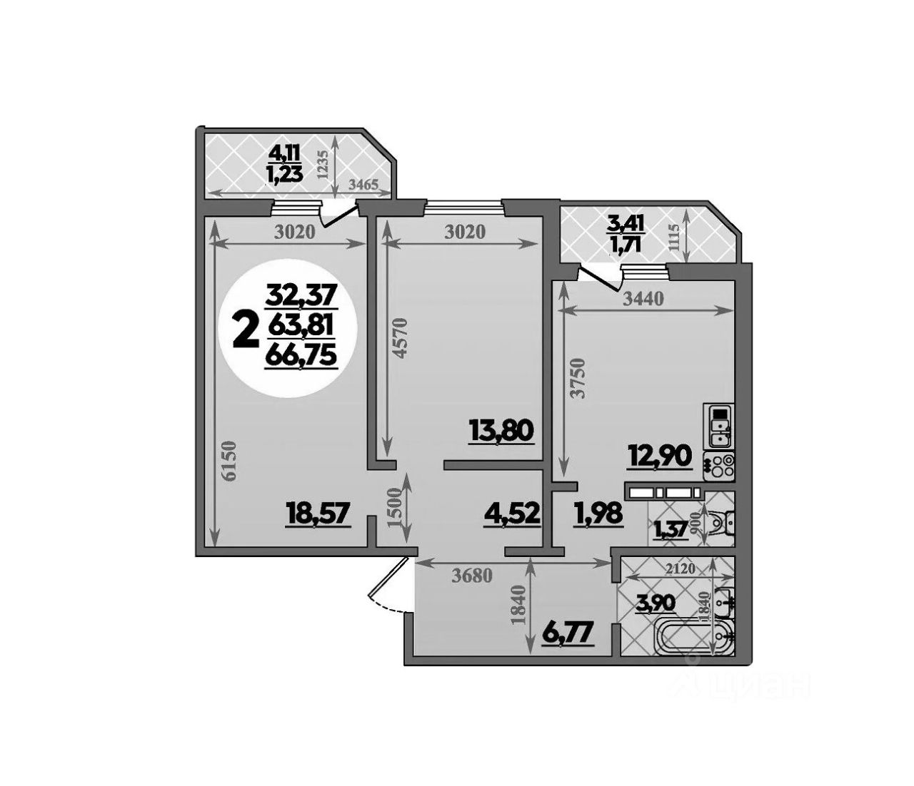 Общая площадь66,75 м2