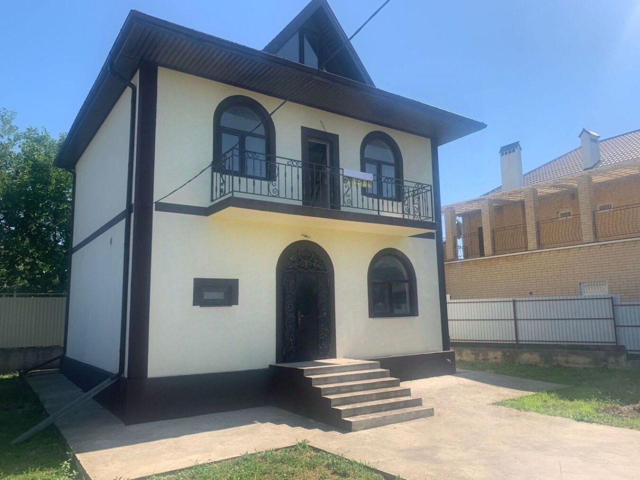 Дом общей площадью 130 кв. метров на участке 3,2 сотки земли с видом разрешенного использования ИЖС. Широкий фасад выходит на тихую малолюдную улицу. Участок полностью огорожен, забор на ленточном фундаменте и зашит профильным листом. Фасадная часть забора выполнена на ленточном фундаменте с кирпичными столбами зашит профильным листом. Установлены качественные ворота с декоративными элементами ковки. Двор полностью благоустроен, тротуарные дорожки и машиноместо выполнены из бетона. Во дворе есть место для грядки или цветника, а также для мангальной зоны.