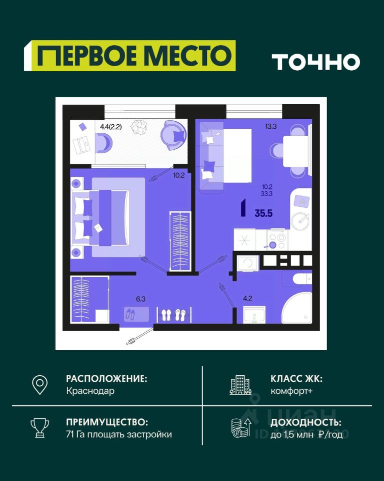 Жилой район ''Первое место''- один из самых масштабных проектов в России. На территории 71 га 18 кварталов, 31 дом переменной этажности от 8 до 18 этажей, собственный парк 9 га, храмовый комплекс, пешеходный бульвар ''Круг семьи'', детские и спортивные площадки, мангальные зоны и различные локации для отдыха. В шаговой доступности действующие муниципальные образовательные учреждения: школа на 1 100 мест и детский сад на 250 мест. Помимо этого, в жилом районе ''Первое место'' построятся школа на 1700 мест с крытым 25-метровым бассейном и 5 детских садов на 1 490 мест. На первых этажах многоуровневых парковок ''паркхабов'' разместится более 61 тыс м2 коммерческих помещений. Жителям будут доступны собственный фитнес-центр, кафе, рестораны и магазины. В каждом подъезде предусмотрены дизайнерские холлы в стиле лобби отелей, консьерж-сервис, лапомойки, отдельные колясочные и велосипедные. Также в домах будут просторные кладовые помещения и комнаты для хранения почты с почтоматами для получения посылок из маркетплейсов.