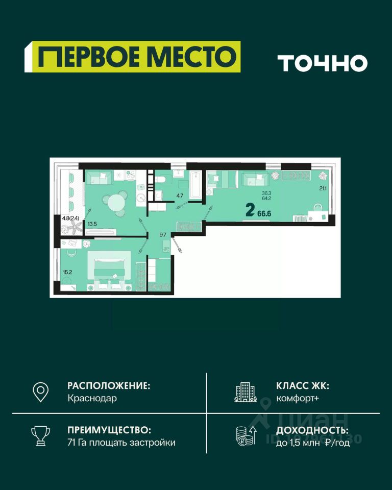 Общая площадь66,6 м2