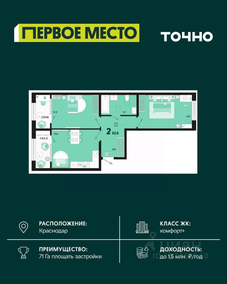 Жилой район ''Первое место''- один из самых масштабных проектов в России. На территории 71 га 18 кварталов, 31 дом переменной этажности от 8 до 18 этажей, собственный парк 9 га, храмовый комплекс, пешеходный бульвар ''Круг семьи'', детские и спортивные площадки, мангальные зоны и различные локации для отдыха. В шаговой доступности действующие муниципальные образовательные учреждения: школа на 1 100 мест и детский сад на 250 мест. Помимо этого, в жилом районе ''Первое место'' построятся школа на 1700 мест с крытым 25-метровым бассейном и 5 детских садов на 1 490 мест. На первых этажах многоуровневых парковок ''паркхабов'' разместится более 61 тыс м2 коммерческих помещений. Жителям будут доступны собственный фитнес-центр, кафе, рестораны и магазины. В каждом подъезде предусмотрены дизайнерские холлы в стиле лобби отелей, консьерж-сервис, лапомойки, отдельные колясочные и велосипедные. Также в домах будут просторные кладовые помещения и комнаты для хранения почты с почтоматами для получения посылок из маркетплейсов.