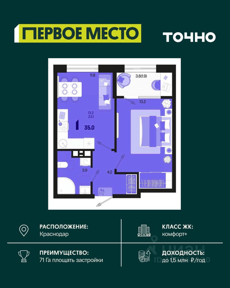 Жилой район ''Первое место''- один из самых масштабных проектов в России. На территории 71 га 18 кварталов, 31 дом переменной этажности от 8 до 18 этажей, собственный парк 9 га, храмовый комплекс, пешеходный бульвар ''Круг семьи'', детские и спортивные площадки, мангальные зоны и различные локации для отдыха. В шаговой доступности действующие муниципальные образовательные учреждения: школа на 1 100 мест и детский сад на 250 мест. Помимо этого, в жилом районе ''Первое место'' построятся школа на 1700 мест с крытым 25-метровым бассейном и 5 детских садов на 1 490 мест. На первых этажах многоуровневых парковок ''паркхабов'' разместится более 61 тыс м2 коммерческих помещений. Жителям будут доступны собственный фитнес-центр, кафе, рестораны и магазины. В каждом подъезде предусмотрены дизайнерские холлы в стиле лобби отелей, консьерж-сервис, лапомойки, отдельные колясочные и велосипедные. Также в домах будут просторные кладовые помещения и комнаты для хранения почты с почтоматами для получения посылок из маркетплейсов.