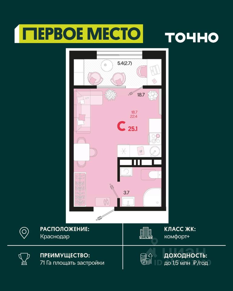 Жилой район ''Первое место''- один из самых масштабных проектов в России. На территории 71 га 18 кварталов, 31 дом переменной этажности от 8 до 18 этажей, собственный парк 9 га, храмовый комплекс, пешеходный бульвар ''Круг семьи'', детские и спортивные площадки, мангальные зоны и различные локации для отдыха. В шаговой доступности действующие муниципальные образовательные учреждения: школа на 1 100 мест и детский сад на 250 мест. Помимо этого, в жилом районе ''Первое место'' построятся школа на 1700 мест с крытым 25-метровым бассейном и 5 детских садов на 1 490 мест. На первых этажах многоуровневых парковок ''паркхабов'' разместится более 61 тыс м2 коммерческих помещений. Жителям будут доступны собственный фитнес-центр, кафе, рестораны и магазины. В каждом подъезде предусмотрены дизайнерские холлы в стиле лобби отелей, консьерж-сервис, лапомойки, отдельные колясочные и велосипедные. Также в домах будут просторные кладовые помещения и комнаты для хранения почты с почтоматами для получения посылок из маркетплейсов.