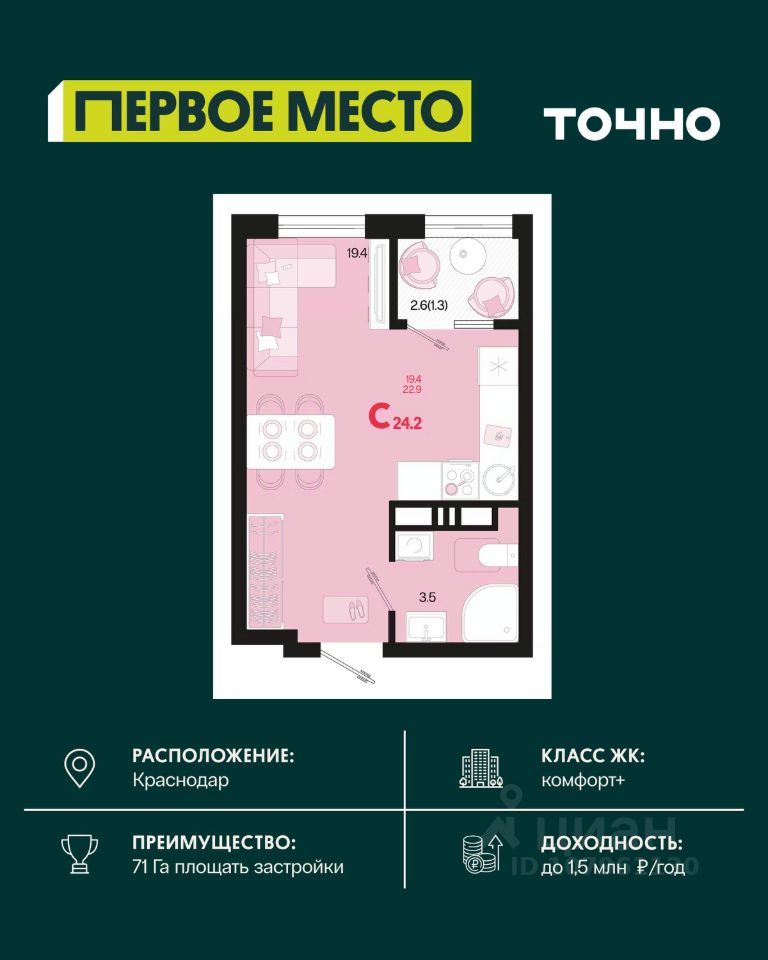 Жилой район ''Первое место''- один из самых масштабных проектов в России. На территории 71 га 18 кварталов, 31 дом переменной этажности от 8 до 18 этажей, собственный парк 9 га, храмовый комплекс, пешеходный бульвар ''Круг семьи'', детские и спортивные площадки, мангальные зоны и различные локации для отдыха. В шаговой доступности действующие муниципальные образовательные учреждения: школа на 1 100 мест и детский сад на 250 мест. Помимо этого, в жилом районе ''Первое место'' построятся школа на 1700 мест с крытым 25-метровым бассейном и 5 детских садов на 1 490 мест. На первых этажах многоуровневых парковок ''паркхабов'' разместится более 61 тыс м2 коммерческих помещений. Жителям будут доступны собственный фитнес-центр, кафе, рестораны и магазины. В каждом подъезде предусмотрены дизайнерские холлы в стиле лобби отелей, консьерж-сервис, лапомойки, отдельные колясочные и велосипедные. Также в домах будут просторные кладовые помещения и комнаты для хранения почты с почтоматами для получения посылок из маркетплейсов.