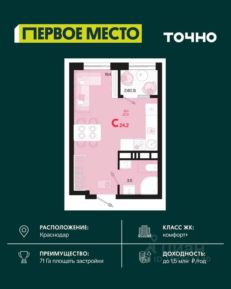 Жилой район ''Первое место''- один из самых масштабных проектов в России. На территории 71 га 18 кварталов, 31 дом переменной этажности от 8 до 18 этажей, собственный парк 9 га, храмовый комплекс, пешеходный бульвар ''Круг семьи'', детские и спортивные площадки, мангальные зоны и различные локации для отдыха. В шаговой доступности действующие муниципальные образовательные учреждения: школа на 1 100 мест и детский сад на 250 мест. Помимо этого, в жилом районе ''Первое место'' построятся школа на 1700 мест с крытым 25-метровым бассейном и 5 детских садов на 1 490 мест. На первых этажах многоуровневых парковок ''паркхабов'' разместится более 61 тыс м2 коммерческих помещений. Жителям будут доступны собственный фитнес-центр, кафе, рестораны и магазины. В каждом подъезде предусмотрены дизайнерские холлы в стиле лобби отелей, консьерж-сервис, лапомойки, отдельные колясочные и велосипедные. Также в домах будут просторные кладовые помещения и комнаты для хранения почты с почтоматами для получения посылок из маркетплейсов.