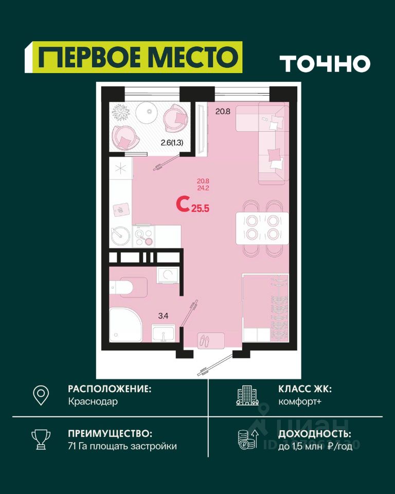 Жилой район ''Первое место''- один из самых масштабных проектов в России. На территории 71 га 18 кварталов, 31 дом переменной этажности от 8 до 18 этажей, собственный парк 9 га, храмовый комплекс, пешеходный бульвар ''Круг семьи'', детские и спортивные площадки, мангальные зоны и различные локации для отдыха. В шаговой доступности действующие муниципальные образовательные учреждения: школа на 1 100 мест и детский сад на 250 мест. Помимо этого, в жилом районе ''Первое место'' построятся школа на 1700 мест с крытым 25-метровым бассейном и 5 детских садов на 1 490 мест. На первых этажах многоуровневых парковок ''паркхабов'' разместится более 61 тыс м2 коммерческих помещений. Жителям будут доступны собственный фитнес-центр, кафе, рестораны и магазины. В каждом подъезде предусмотрены дизайнерские холлы в стиле лобби отелей, консьерж-сервис, лапомойки, отдельные колясочные и велосипедные. Также в домах будут просторные кладовые помещения и комнаты для хранения почты с почтоматами для получения посылок из маркетплейсов.