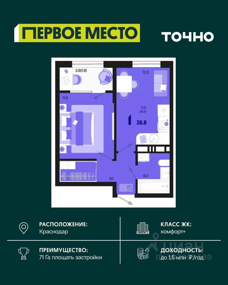 продам 1-к, Виктора Казанцева, 1.55 814 400 ₽