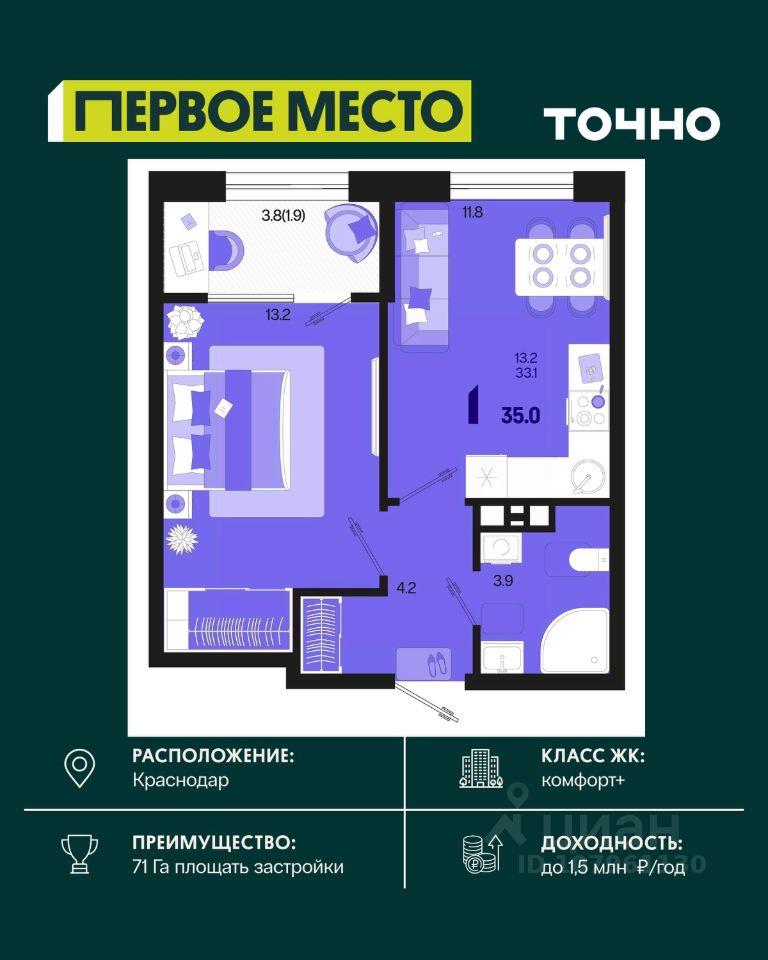 Жилой район ''Первое место''- один из самых масштабных проектов в России. На территории 71 га 18 кварталов, 31 дом переменной этажности от 8 до 18 этажей, собственный парк 9 га, храмовый комплекс, пешеходный бульвар ''Круг семьи'', детские и спортивные площадки, мангальные зоны и различные локации для отдыха. В шаговой доступности действующие муниципальные образовательные учреждения: школа на 1 100 мест и детский сад на 250 мест. Помимо этого, в жилом районе ''Первое место'' построятся школа на 1700 мест с крытым 25-метровым бассейном и 5 детских садов на 1 490 мест. На первых этажах многоуровневых парковок ''паркхабов'' разместится более 61 тыс м2 коммерческих помещений. Жителям будут доступны собственный фитнес-центр, кафе, рестораны и магазины. В каждом подъезде предусмотрены дизайнерские холлы в стиле лобби отелей, консьерж-сервис, лапомойки, отдельные колясочные и велосипедные. Также в домах будут просторные кладовые помещения и комнаты для хранения почты с почтоматами для получения посылок из маркетплейсов.
