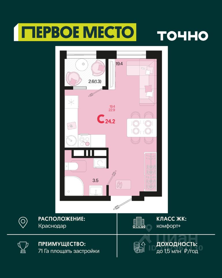 Жилой район ''Первое место''- один из самых масштабных проектов в России. На территории 71 га 18 кварталов, 31 дом переменной этажности от 8 до 18 этажей, собственный парк 9 га, храмовый комплекс, пешеходный бульвар ''Круг семьи'', детские и спортивные площадки, мангальные зоны и различные локации для отдыха. В шаговой доступности действующие муниципальные образовательные учреждения: школа на 1 100 мест и детский сад на 250 мест. Помимо этого, в жилом районе ''Первое место'' построятся школа на 1700 мест с крытым 25-метровым бассейном и 5 детских садов на 1 490 мест. На первых этажах многоуровневых парковок ''паркхабов'' разместится более 61 тыс м2 коммерческих помещений. Жителям будут доступны собственный фитнес-центр, кафе, рестораны и магазины. В каждом подъезде предусмотрены дизайнерские холлы в стиле лобби отелей, консьерж-сервис, лапомойки, отдельные колясочные и велосипедные. Также в домах будут просторные кладовые помещения и комнаты для хранения почты с почтоматами для получения посылок из маркетплейсов.