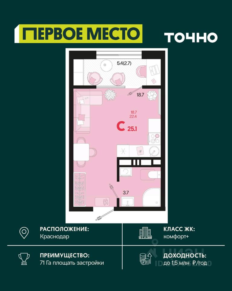 Жилой район ''Первое место''- один из самых масштабных проектов в России. На территории 71 га 18 кварталов, 31 дом переменной этажности от 8 до 18 этажей, собственный парк 9 га, храмовый комплекс, пешеходный бульвар ''Круг семьи'', детские и спортивные площадки, мангальные зоны и различные локации для отдыха. В шаговой доступности действующие муниципальные образовательные учреждения: школа на 1 100 мест и детский сад на 250 мест. Помимо этого, в жилом районе ''Первое место'' построятся школа на 1700 мест с крытым 25-метровым бассейном и 5 детских садов на 1 490 мест. На первых этажах многоуровневых парковок ''паркхабов'' разместится более 61 тыс м2 коммерческих помещений. Жителям будут доступны собственный фитнес-центр, кафе, рестораны и магазины. В каждом подъезде предусмотрены дизайнерские холлы в стиле лобби отелей, консьерж-сервис, лапомойки, отдельные колясочные и велосипедные. Также в домах будут просторные кладовые помещения и комнаты для хранения почты с почтоматами для получения посылок из маркетплейсов.